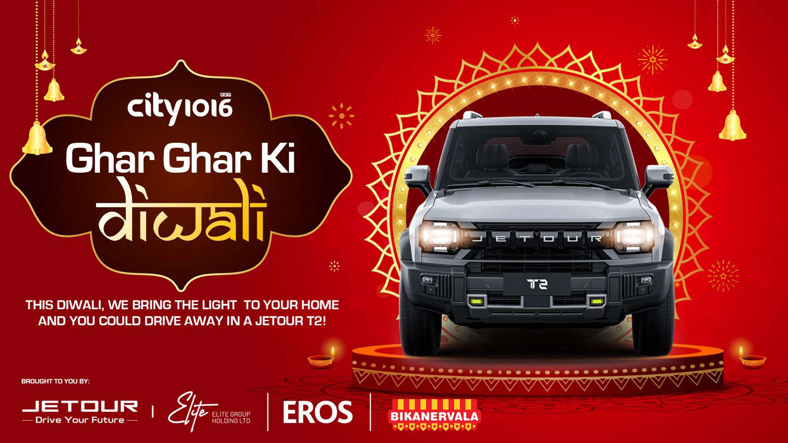 That's right Team City 1016 is storming or shall we say zipping into your house with A CAR and a massive Diwali hamper. Ghar Ghar Ki Diwali with Jetour, Eros and Bikanervala. Tune in to City 1016 and share your Diwali stories with us and we will come down to your house with Bikaner Diwali Hampers.